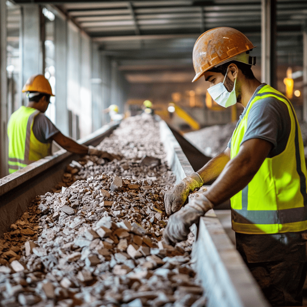 A triagem detalhada é realizada pela Luca Ambiental, separando materiais recicláveis para reaproveitamento. Os resíduos transformam-se em agregados de alta qualidade, que podem ser reutilizados na própria obra, fechando o ciclo sustentável.